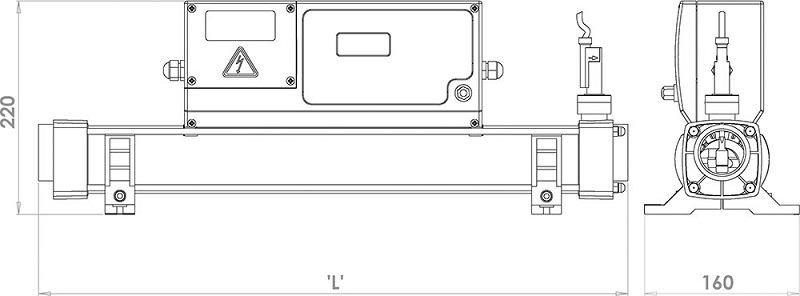 Le réchauffeur est monté sur deux pieds pivotants pour permettre le montage mural ou bien au sol. Les éléments de contrôle se trouvent sur la face de devant du boitier. Les éléments d’entrée et de sortie d’eau permettent le raccord de tubes métriques ou standards. L’élément d’entrée d’eau a été conçu pour permettre l’immersion totale des résistances, ce qui réduit considérablement les risques de formation de poches d’air.